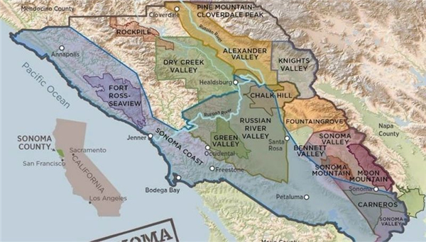 知名的納帕谷AVA旁邊,其實有一個較鮮為人知但圈內人很推崇的大產區,叫索諾馬 (Sonoma) AVA,其緯度、氣候與納帕谷相當,區域面積更廣,也更靠近海洋,整體而言更能凸顯風土變化,因此更能夠找到適合每一品種的區域進行種植。