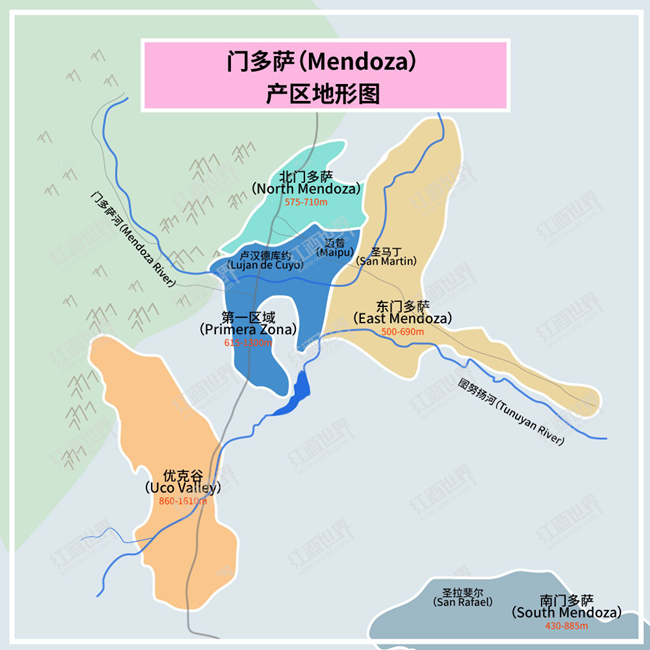 在阿根廷的中西部,美麗的安第斯山脈(Andes Mountain Range)山腳下,坐落著阿根廷最重要的葡萄酒產區(qū)之一——門多薩(Mendoza)。該產區(qū)大致可分為五個子區(qū)域——第一區(qū)域(Primera Zona)、東門多薩(East Mendoza)、北門多薩(North Mendoza)、優(yōu)克谷(Uco Valley)和南門多薩(South Mendoza)。產區(qū)內的葡萄園面積占阿根廷葡萄園總面積的75%,酒莊數(shù)量也穩(wěn)居阿根廷國內第一。