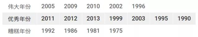 所謂“年份”,指的就是葡萄收成的那一年。年份之所以值得關注,是因為某個特定年份的氣候會對當年的收成質量造成影響。每一年,專業(yè)的葡萄酒媒體如Wine Enthusiast、Wine Advocate和Wine Spectator等都會依據(jù)氣候條件對年份進行評分,以及非常詳盡的年份參考,引導消費者哪些年份適合當下飲用,以及哪些年份還能夠陳放一定時間。