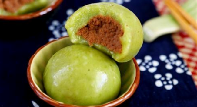 青團油綠如玉,糯韌綿軟,團子的餡心由細膩的糖豆沙制成,其口味香甜、軟糯。