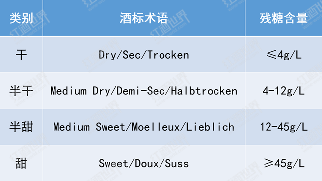 根據(jù)酒液中的殘?zhí)橇浚藗儗㈧o止葡萄酒分成了四個(gè)類別:干型(Dry)、半干型(Medium)、半甜型(Medium Sweet)和甜型(Sweet)。