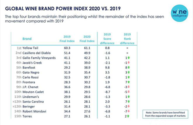 在2020年,值得注意的變化包括貝爾富特(Barefoot)和遠(yuǎn)山(Frontera),前者上升了8位,進(jìn)入前5名,后者上升了7位,排在第8位。圣卡羅(Santa Carolina)也上升了7位,與貝靈哲(Beringer)并列第12位。木桐嘉棣(Mouton Cadet)跌了5位,排在第10位;蒙大維(Robert Mondavi)跌了7位,排在第14位。桃樂絲(Torres)今年也上升了兩位,進(jìn)入前15名。