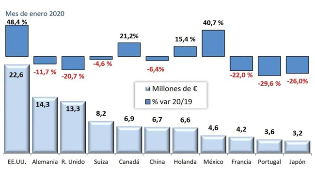 根據(jù)西班牙葡萄酒市場(chǎng)觀察(OeMV)提供的數(shù)據(jù),在2020年的第一個(gè)月,西班牙葡萄酒出口的平均銷售價(jià)格上漲7.5%,達(dá)到1.26歐/升,這使得銷售額的下降幅度低于出口量(銷售額下降1.3%,出口量下降8.1%)。