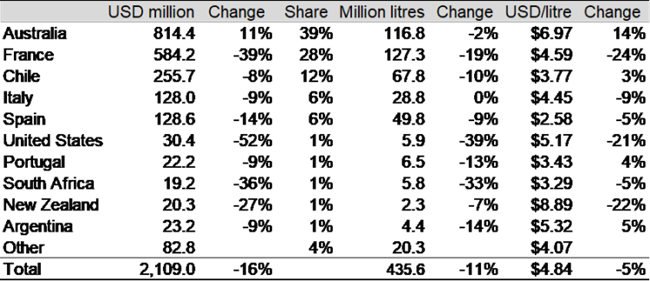 根據(jù)全球貿(mào)易數(shù)據(jù)庫(Global Trade Atlas)的數(shù)據(jù)顯示,截至 2020 年 2 月底的 12 個月,中國的葡萄酒進(jìn)口總額下降了 17%(美元),進(jìn)口量下降了 14%。這一下降主要是受到法國瓶裝酒進(jìn)口額下降 39%的影響(見表 1)。而瓶裝澳大利亞葡萄酒的進(jìn)口額則上升了 11%,澳大利亞也成為唯一一個在瓶裝葡萄酒進(jìn)口額上保持上升趨勢的進(jìn)口來源國。