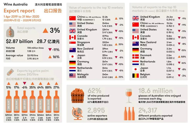 關(guān)于3月份的統(tǒng)計數(shù)字,澳大利亞葡萄酒管理局統(tǒng)計數(shù)字顯示,出口額相比上年同期降低了43%。今年1~3月份澳洲酒對華出口額也降低了14%,下降幅度明顯,而這主要是因為疫情所導(dǎo)致。即使這樣,如果算上2019年的后三個季度,澳洲酒在中國仍然強勢增長,可見2019年奠定的優(yōu)勢有多大!