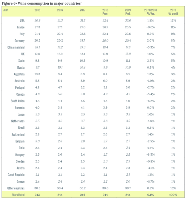 2019年,占全球消費量53%的歐盟估計消費了約128 百萬升的葡萄酒,這一數字與近年來持平。值得一提的是,日本是亞洲第二大消費國(世界第15位),消費量連續第六年保持穩定,為3.5 百萬升。