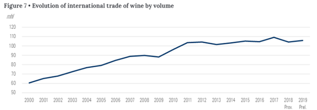 (2000—2019葡萄酒國際貿易量的演變)