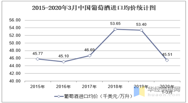 2015-2020年3月中國葡萄酒進(jìn)口均價統(tǒng)計圖