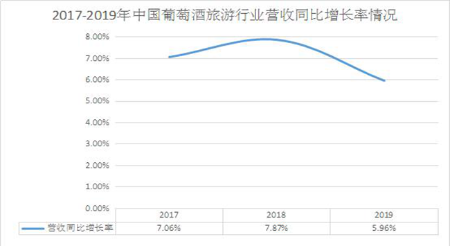 據(jù)不完全統(tǒng)計(jì),2019年中國(guó)葡萄酒旅游行業(yè)營(yíng)收同比增長(zhǎng)率約為5.96%,在旅游行業(yè)中,處于上游水平,行業(yè)發(fā)展能力較良。