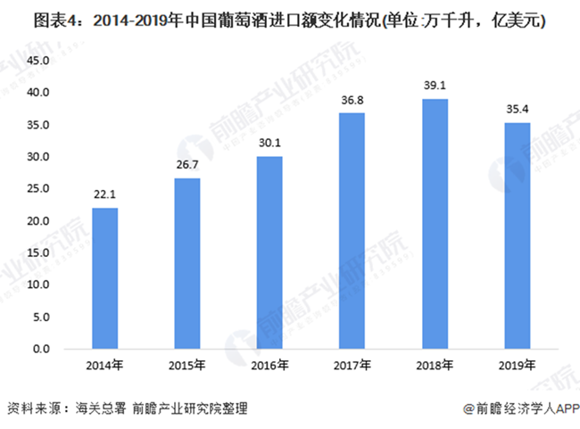 海關數據顯示,2019年,受行業景氣程度影響,我國葡萄酒進出口額均有所下降,進口額實現35.4億美元,出口額實現1.8億美元,進口額跌幅高于出口額。整體進出口總額降為37.2億美元,實現貿易逆差33.6億美元。