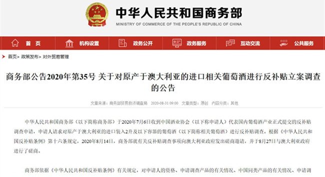 根據(jù)上述審查結(jié)果,依據(jù)《中華人民共和國反補(bǔ)貼條例》第十六條的規(guī)定,商務(wù)部決定自2020年8月31日起對原產(chǎn)于澳大利亞的進(jìn)口相關(guān)葡萄酒進(jìn)行反補(bǔ)貼立案調(diào)查。現(xiàn)將有關(guān)事項(xiàng)公告如下: