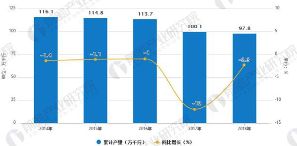 具體來看,2016年全國葡萄酒產量達113.7萬千升,同比下滑1%。預計2018年中國葡萄酒產量將下滑至107.2萬千升。