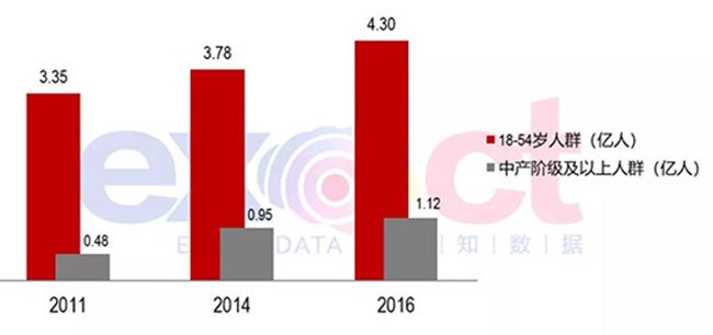 從2011年到2016年間,18-54歲葡萄酒消費(fèi)人群擴(kuò)大,由3.35億人增長(zhǎng)到4.3億人。其中,中產(chǎn)階級(jí)以上人群(葡萄酒主力消費(fèi)人群)不斷上升,從2011年0.48億人上升到2016年1.12億人。