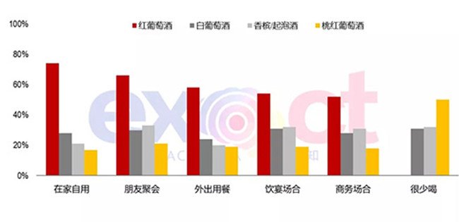 消費(fèi)者不同場(chǎng)合飲用各類葡萄酒占比(2017)