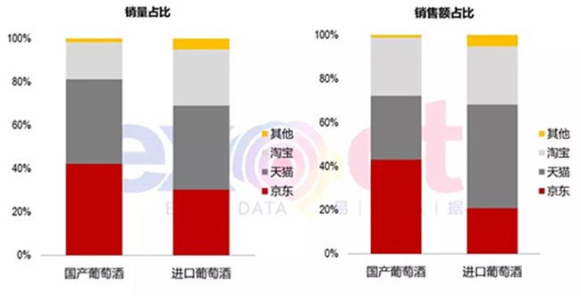從平臺(tái)分布來(lái)看,無(wú)論國(guó)產(chǎn)還是進(jìn)口葡萄酒均在天貓、京東、淘寶銷售情況最佳,銷售占比超過(guò)90%。對(duì)比來(lái)看,國(guó)產(chǎn)葡萄酒在京東的銷售優(yōu)于其他平臺(tái),而進(jìn)口葡萄酒則以天貓為主要銷售陣地。