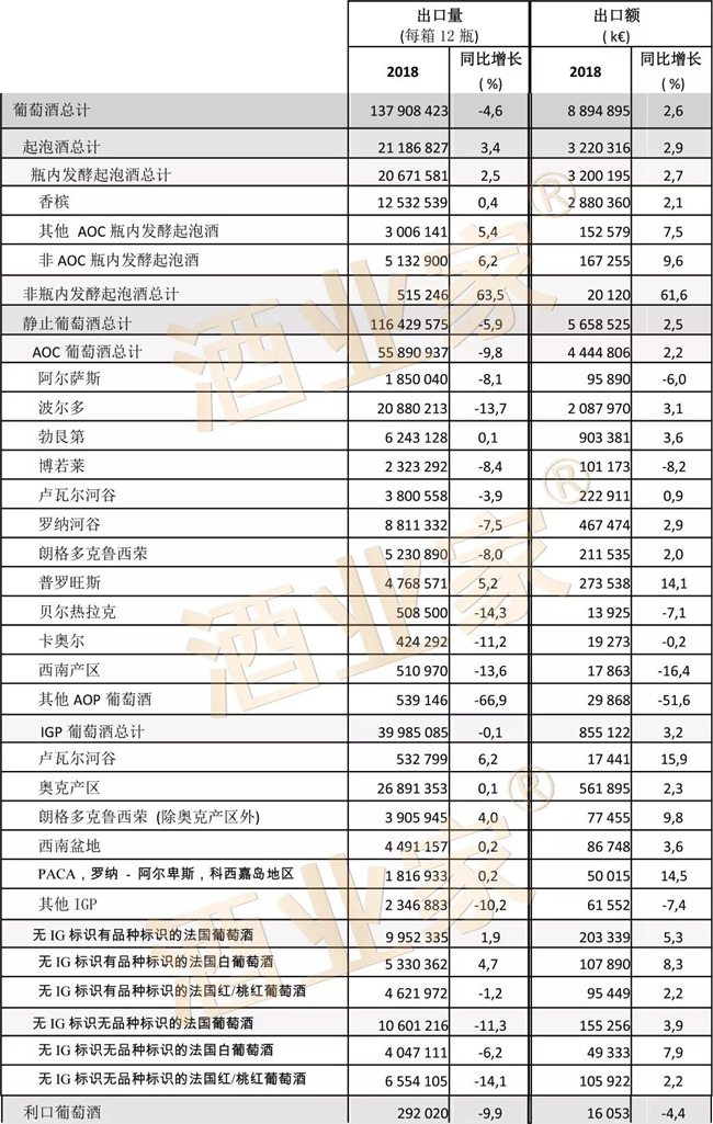 據(jù)FEV S(法國葡萄酒及烈酒出口商聯(lián)盟)發(fā)布的2018年法國葡萄酒與烈酒出口報(bào)告顯示,2018年法國 對外出口量下降2.7%,至1.93億箱; 出口額增長2.4%,超過132億歐元。