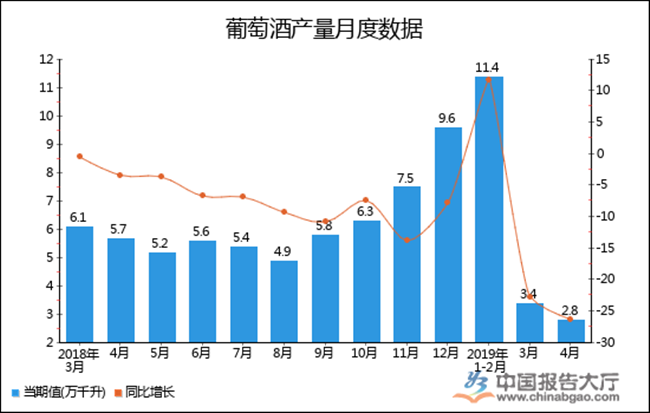 根據中國報告大廳對2019年1-4月全國葡萄酒產量進行監測統計顯示:2019年4月全國葡萄酒產量2.8萬千升,同比下降26.3%,2019年1-4月全國葡萄酒產量為13.4萬千升,累計下降26.8%。