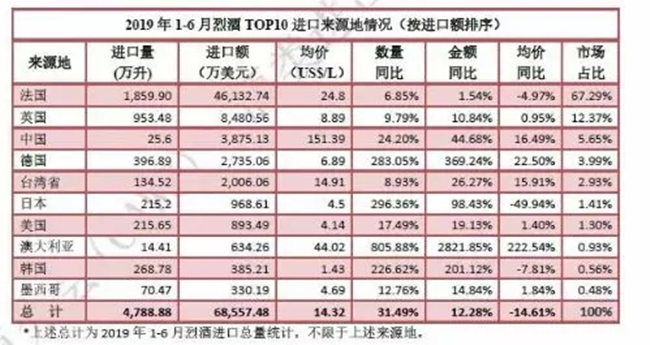 數(shù)據(jù)顯示,在過去5年中,全球烈酒市場以平均每年4.7%的速度增長,預(yù)計到2020年,市場消耗量仍將增加1.2億箱,突破32億箱大關(guān),其中,增長的最大份額將來自中國。從酒類進(jìn)出口商分會公布的數(shù)據(jù)來看,2019年上半年,烈酒進(jìn)口量實現(xiàn)了超三成的增長,進(jìn)口額也實現(xiàn)了12.28%的增長。從來源國來看,法國均價下降4.97%,但進(jìn)口量繼續(xù)保持增長,市場占比仍據(jù)首位;英國量額增幅有一定下滑,但仍居第二;日本、澳大利亞、韓國延續(xù)高速增長。