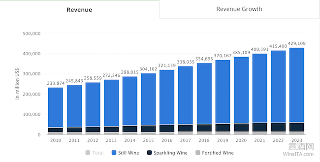 盡管2019年的這些數字看來已經足夠龐大,但根據Statista.com的預判,到2023年,全球葡萄酒市場將更上一層樓,達到4290億美元的總交易額。促使全球葡萄酒交易額上升的主要原因是葡萄酒價格的上升,而未來四年全球葡萄酒的銷量交易量將穩定在每年270億升左右。