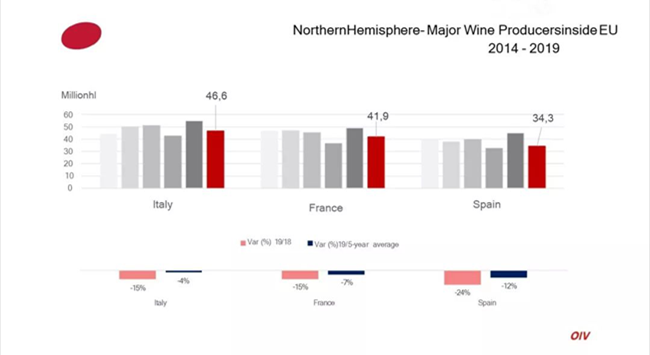 OIV工作人員對媒體表示,2019年全球葡萄酒減產(chǎn)的主因是“氣候災害”。很多產(chǎn)區(qū)經(jīng)歷了寒冷多雨的春天與極度炎熱干燥的夏天,葡萄產(chǎn)量減少。