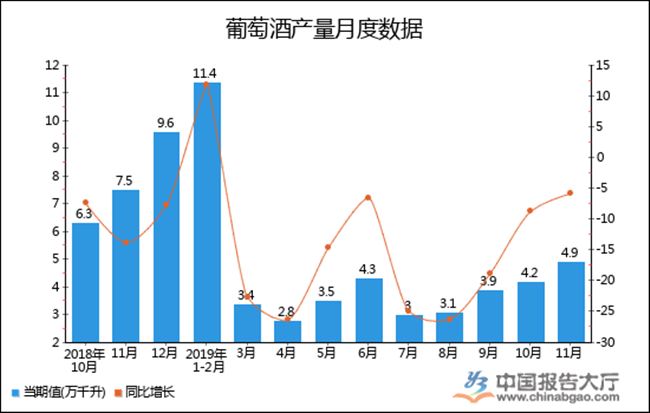 2019年1-02月全國(guó)葡萄酒產(chǎn)量累計(jì)值為11.4萬(wàn)千升,累計(jì)增長(zhǎng)11.8%。